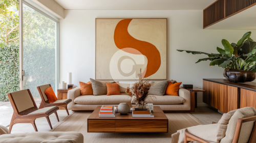 Mid-century modern living room with mid-century wood cabinets, tan and orange accents, white walls, wooden coffee table, natural light, large painting on the wall above the sofa, mid-century chairs. --ar 16:9 --v 6.1
