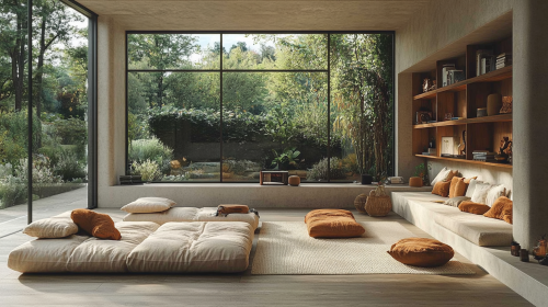 A mid-century modern home interior with a large window and walls that feature bookshelves, a leather sofa, an area rug, wall art, and natural light streaming in from the windows. The living room is cozy yet spacious, showcasing warm tones of brown and beige to create warmth and comfort. There's also decorative lighting on shelves for accent and muted color. This setting creates a comfortable space where people can gather, read books, or have coffee while enjoying the view outside. --ar 16:9 --v 6.1