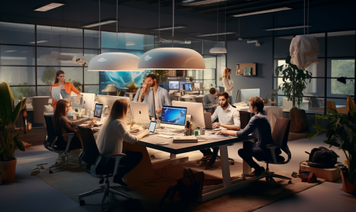 creative meeting of copywriters working on a digital ad campaign - photorealistic - office setting --ar 5:3