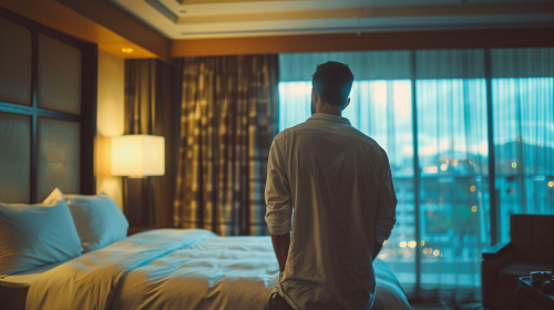 a man is confused when the ring is missing from the hotel room at a new 2023 modern pan pacific hotel, bright lighting, 35mm lens, --ar 16:9 --v 6.0