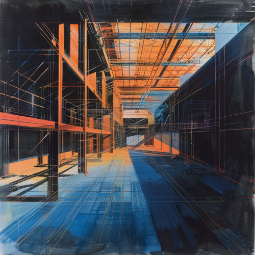 copper sketch of the inside of a warehouse from an frontal 70 degree Angular perspective against a black and blue gradient background