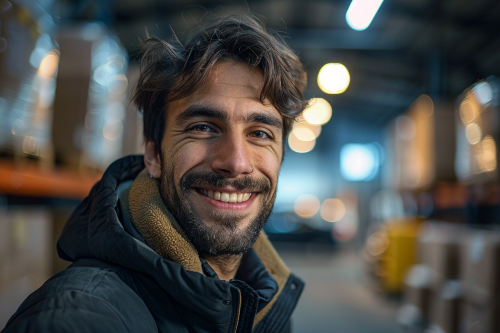 close-up man smiling and in the background an empty warehouse with boxes in different parts and a car in the center, night light emulating a Canon EF 24-70 mm f/2.8 L II USM camera, eye level perspective --ar 3:2 --s 250 --v 6.0