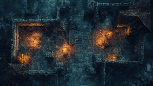 a top down view of a battle map for dungeons and dragons, map shows a castle ground floor, kitchen, dining hall, large room with weapons, staircase, ar 16:9