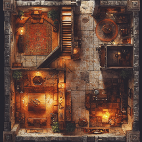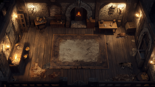a birds eye view battle map for dungeons and dragons, the map is off an old castle office with wooden floors, a desk, an animal rug, and various bits that would be found in a castle are there