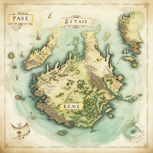 a map drawn by a twelve-year-old, of an imaginary kingdom, including a castle, cliffs above the sea, mythical animals, villages, mountains, rivers, and lakes