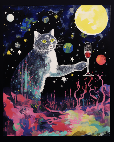 imaginative and magical risograph of a cat holding a glass of wine while standing on a platform that is disintegrating. Stars, planets, and moons are in the background. Dark with pops of bright colors. --ar 4:5 --s 50