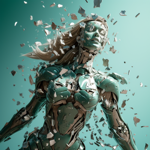 photorealistic, a woman disintegrating her armour, background light turquoise green shade colors--ar 2:3
