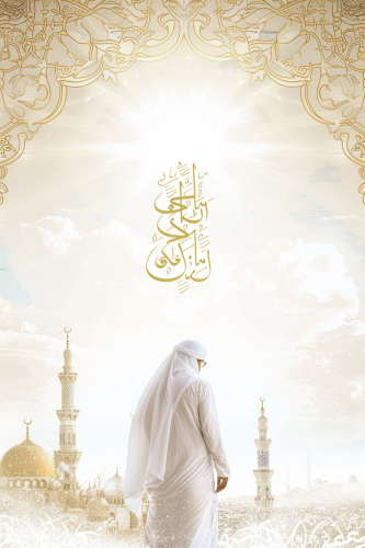 A back-view of a Turkish imam walking towards a glowing white horizon. One side is marked by the faint outline of a mosque, the other by modern German structures. The sky, bathed in soft light, shows a crescent moon and Quranic verses floating above, suggesting spiritual protection and guidance. The hierarchy elevates the spiritual motifs, while the light background evokes a feeling of peace. Title in minimalist, bold typography, with Arabic accents --ar 2:3 --v 6.0