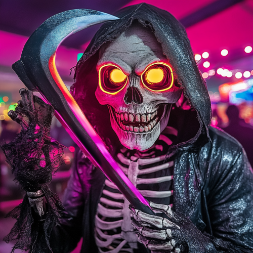 man djing at a desk wearing a glowing light up LED cyborg Skelton mask