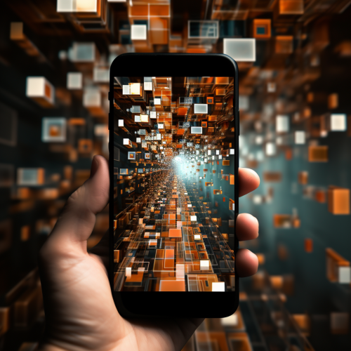an immersive reality, photo realistic shot of a cell phone screen with a pattern of squares in it in the style of KODAK FASHION 2 250D chesley Bonestall, fragmentation of forms, microfilm photo taken with pro 2 3:2