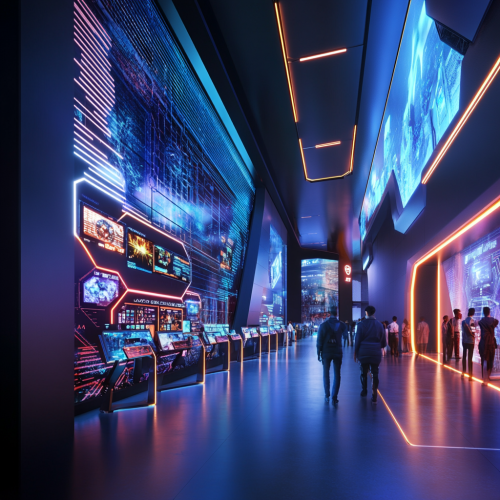 A zone in an entertainment exhibition called: Gamified Experiences: Interactive Games: Create custom games or challenges related to entertainment and events, such as scavenger hunts with industry-related themes. The zone theme should be characterized by a vibrant color palette, including fuchsia, blue, yellow, purple, and white, to enhance the visual impact and overall atmosphere. The zone should include Saudi people.