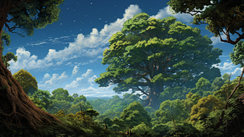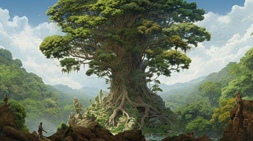 immense, tall tree, towering a thousand feet above the forest canopy, photorealistic, highly detailed, people live in it, --ar 16:9