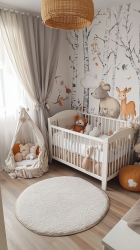 Une chambre de bébé réaliste avec une ambiance douce et sereine. La pièce est décorée dans des couleurs pastel et une lumière douce. Inclure des décorations d'animaux de la forêt comme un faon, un bébé renard et quelques lapins moelleux sous forme de décorations murales, peluches ou mobiles. La chambre doit comporter un berceau, une table à langer et des éléments de décoration sur le thème de la forêt, tels que du papier peint avec des motifs de feuilles. Qualité haute, 8K, HDR. --ar 9:16