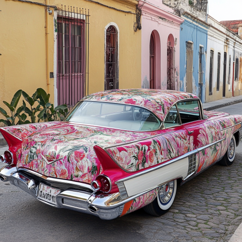 Crie uma imagem realista de um Cadillac Coupe De Ville de 1959 com uma pintura exterior que imita o design de um tapete de Arraiolos. O carro deve exibir os padrões detalhados e as cores vibrantes típicas dos tapetes de Arraiolos, incluindo elementos florais e geométricos tradicionais. Posicione o carro em um ambiente elegante e atemporal, como uma rua clássica ou uma garagem vintage, para complementar o estilo retrô do veículo. Certifique-se de que a textura e os detalhes do tapete estejam visivelmente integrados na superfície do carro, destacando a fusão entre o design automotivo e o artesanato tradicional