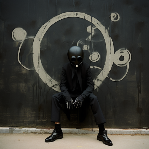 photography by Steve Marsell, man model with metal futurist Mickey Mouse mask,wears yoji Yamamoto black cotton suit, long black skirt, vintage sneaker distress black leather, off white background, post atomic atmosphere , some vandal graffiti on the back --v 5.2