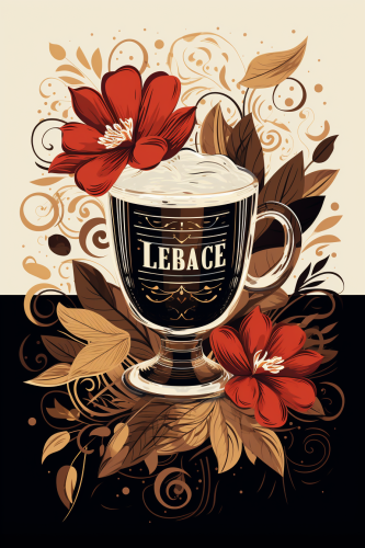 flat graphic poster for a liquor de cafe. Graphics on it are black on white background with coffee beans and glass for a liquor. Framed with floral ornament. --ar 2:3