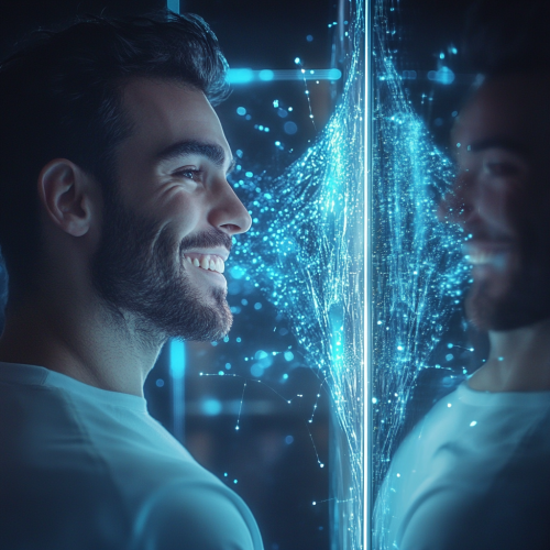 A man looks at himself in a futuristic mirror, smiling as his hair grows in real-time. Blue digital lights and soft glowing particles surround him, symbolizing hair regeneration and technology. His face shows excitement and pride, with the sleek, modern setting adding a sci-fi vibe