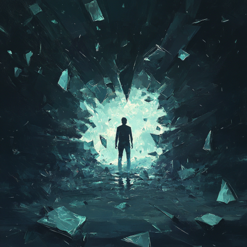 Create a surreal and melancholic scene featuring a shattered mirror or reflective surface suspended in a dark, abstract void. The mirror is broken into irregularly shaped fragments, with some pieces reflecting distorted parts of a solitary figure standing in the center of the composition. Surround the figure with floating shards, each glowing faintly as they catch light from an unseen source. The void-like background should be dark, with deep blues, blacks, and grays, but the mirror pieces should introduce hints of metallic silver and soft whites to add contrast. Incorporate small, glowing particles drifting through the scene, reflecting off the shards to give a slightly energetic, dynamic feel. The overall mood should convey a sense of loneliness and fragmentation, blending darkness with subtle touches of light.