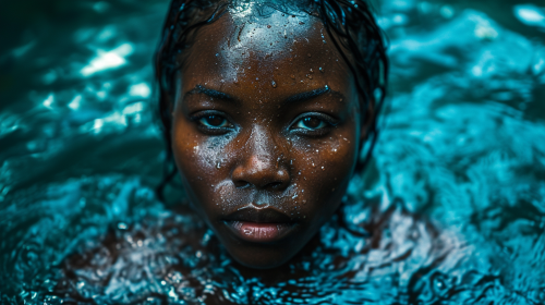 a cyborg black girl floating in a pool of mercury, liquid chrome, futuristic, escaping from violent mob, dramatic scene, shot from above --s 750 --ar 16:9 --v 6.0