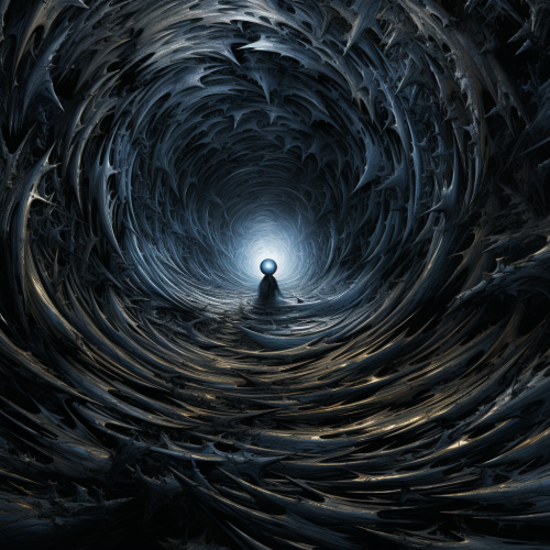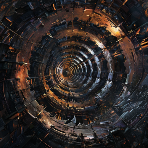The Futuristic non-linear non-euclidean dark energy charred, sheen, degradation, vortical XenoMorph Time Spiral, dizzying Melting Tendrils that melt a Futuristic Escape Velocity organisms evolving in the void of the transcendental capitalist machine melting overdrive and dissipating at the speed of light inside an mise-en-abyme, optical illusion mirror, anamorphic effect, impossible illusory looking atomic clock at the Event Horizon of a Black Hole melting in the style of H.R. Giger, Ghost in The Shell, unreal engine asset, 4d object, maximum detail, strong contrast and high exposure. Uhd, 8K.