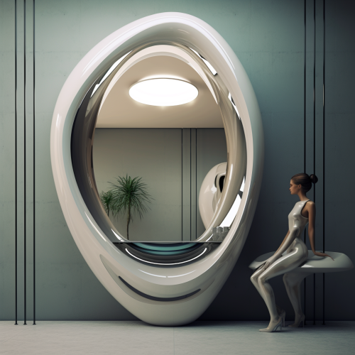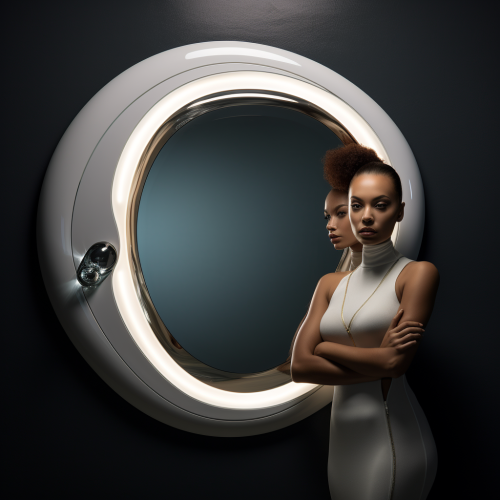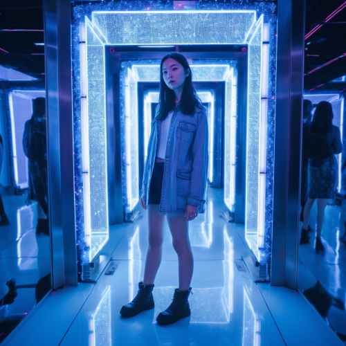 Full-body immersive mirror, with blue LED lights, at a hyper-realistic, artificial intelligence-themed marketing event, --ar 1:1 --v 5.0