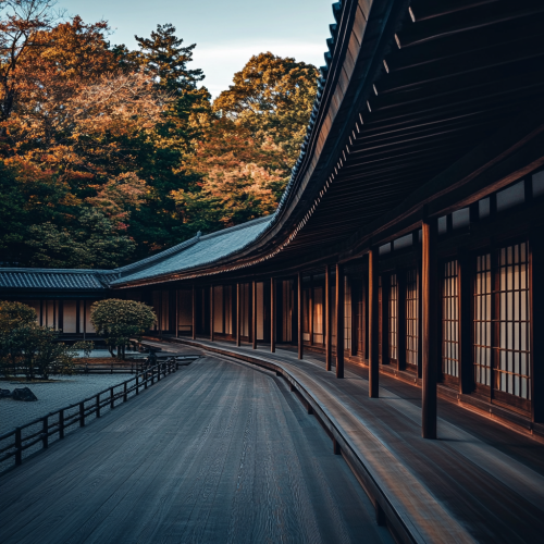 modest architectural photorealistic image of a the exterior of the katsura imperial villa in Kyoto, autumn day in japan, Sony Alpha 7R V, 35mm lens, f/16, soft natural light on a cool japanese day, deep depth of field, subdued colors, ISO 250, 1/60 sec --style raw --stylize 50 --v 6.1