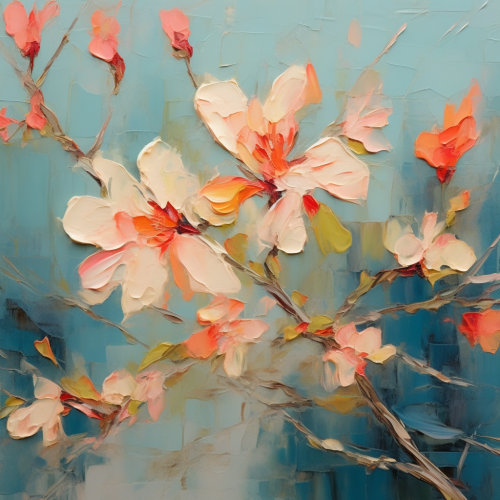 flower & branch painting, hyper impressionist, cream background, coral colors, wall art --q .25