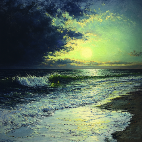 Pintura impressionista pastel e grafite de William trost Richards numa costline seascape . Tinta encáustica a óleo, azul e neon fluo amarelo e verde e linogravura elétrica