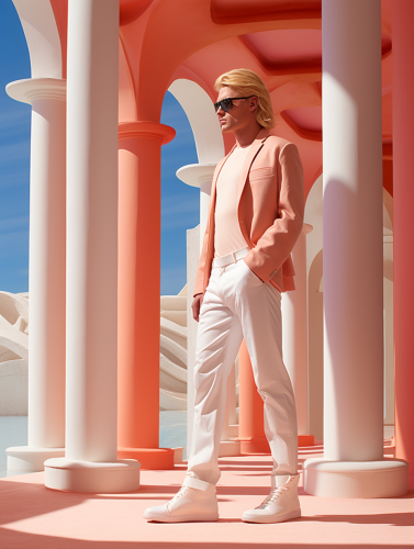 Fusion of euronism and art eurofuturism, nordic style, impressive muscular blond man, minimalism, futurism, assorted model poses, full body shot, background Ricardo Bofill architectural style, peach, vanilla, hot summer, high temperature, hasselblad, high image quality, 16k, hyper realistic --ar 4:3 --style raw --s 750