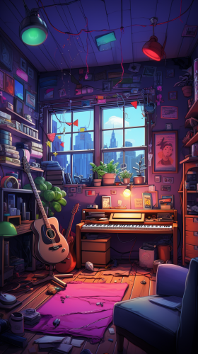 Crea una imagen que muestre a un grupo de amigos disfrutando de la música juntos a través de una aplicación de streaming en una gran pantalla en su sala de estar, con luces de colores que llenan la habitación. --ar 9:16 --stylize 250 --v 5.2