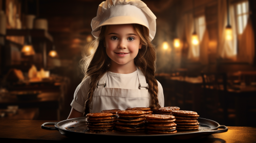 a little girl wearing a white chefs hat, serving a plate of pancakes covered in barbeque sauce, cinematic, photorealistic --ar 16:9