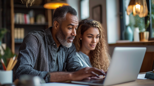 Image of a man assisting his wife as she sits at a home office desk, engaged in using QuickBooks software. --ar 16:9 --stylize 350 --style raw --v 6.0