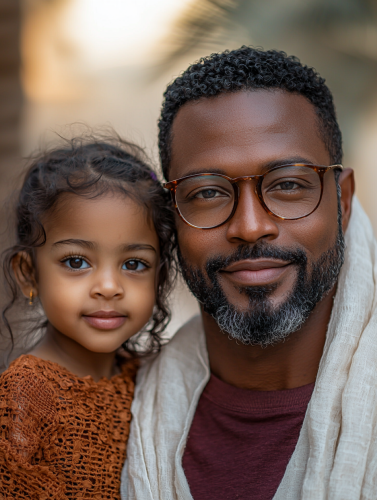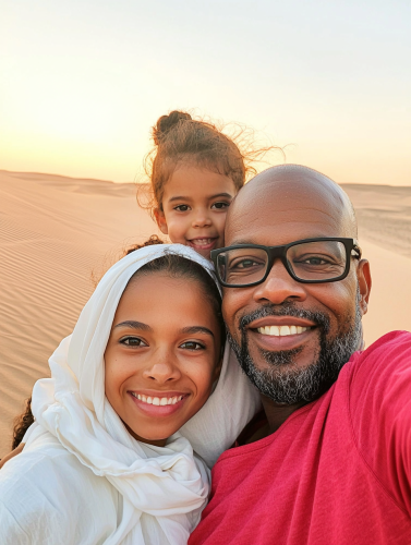 a selfie of an African American man, with his Lebanese wife, and 4 year daughter. The daughter has green eyes. The location is the desert of Dubai during the sunset. we can see the dunes in the background. The African American man is wearing glasses, and new school red baggy t shirt, and a white scarf covering his head, took from iPhone 16, in 2024 in the style of Alex Webb, candid::3 30mm lens, shot in 2024, candid, minimalism, moody, modern, cinematic realism, Eye Level Shot, shot with hasselblad 30mm, Kodak Ektar 100::1 --no black and white photography --ar 3:4 --style raw --stylize 0 --q 2
