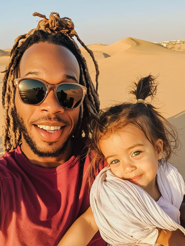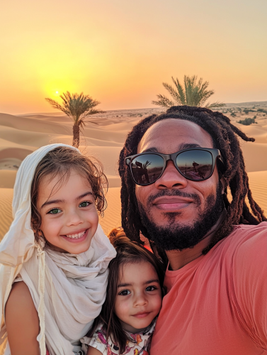 a selfie of a 21 year old African American man, with his Lebanese wife, and 4 year daughter. The daughter has green eyes. The wife looks like Nancy Ajram. The location is the desert of Dubai during the sunset. We can see the dunes in the background and a little oasis with water and with palm trees. The African American man is wearing sunglasses, and clear red baggy t shirt, and a white scarf covering his head, he also got dreadlocks, took from iPhone 16, in 2024 in the style of Alex Webb, candid::3 30mm lens, shot in 2024, candid, minimalism, moody, modern, cinematic realism, Eye Level Shot, shot with hasselblad 30mm, Kodak Ektar 100::1 --no black and white photography --ar 3:4 --style raw --stylize 0 --q 2