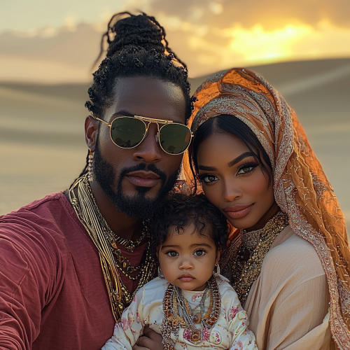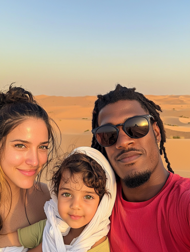 a photo of an african american men with his arab wife in the desert of Dubai holding their 3 year old daughter and all are facing the camera. All of them have green eyes. The dunes and sunset are clearly visible behind them. The men is wearing an oversized red new fashion t-shirt, large sunglasses and jewelry, with a traditional arab scarf over his head. The photo was taken on an iPhone and posted on instagram as a selfie picture-- ar 3:4 --s 750 --q 2