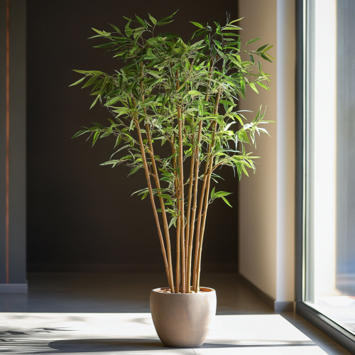 Bamboo Tree - 120 cm A beautifully crafted artificial bamboo tree that enhances the ambiance of any room with its lush, green leaves on the floor at the outdoor dubai luxury house, with sunlight and bright colors, professiolan photography, 4k, unique compose, shine