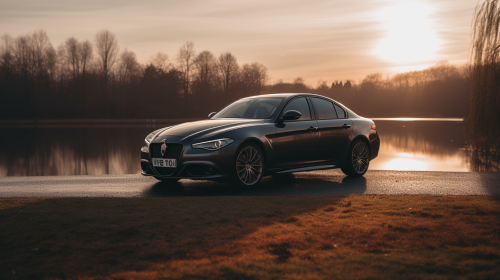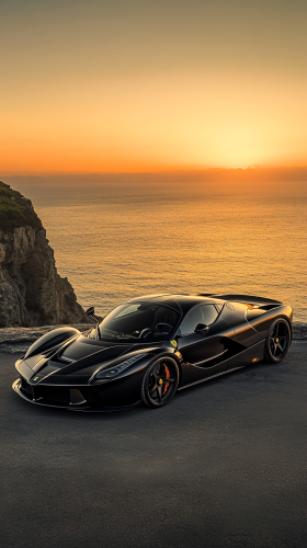 A sleek black Ferrari LaFerrari parked on an Italian coastal cliff, overlooking the azure sea as the sun sets, casting a golden hue over the car's lines. --ar 9:16