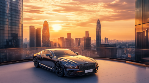 A luxury car parked on a high-rise rooftop overlooking a modern city skyline at sunset, soft golden light reflecting on glass skyscrapers, high-end urban setting, sleek and refined, ultra-realistic --ar 16:9 --v 6.1
