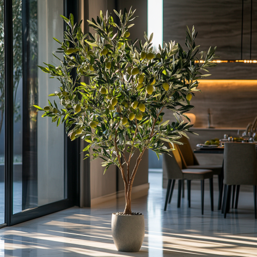 Olive Tree - 180 cm A lifelike olive tree with realistic fruits, adding Mediterranean charm on the cofloor at the dinning room at the dubai luxury house, with sunlight and bright colors, professiolan photography, 4k, unique compose, shine