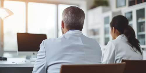 a photo of a doctor in his office, sitting at his desk, on his computer. We see him from behind and up close, behind his shoulder. He's wearing a white coat. The office is white and uncluttered. photography using a 50mm lens, f/2.8 aperture, natural lighting, --ar 4:2 --v 5.2