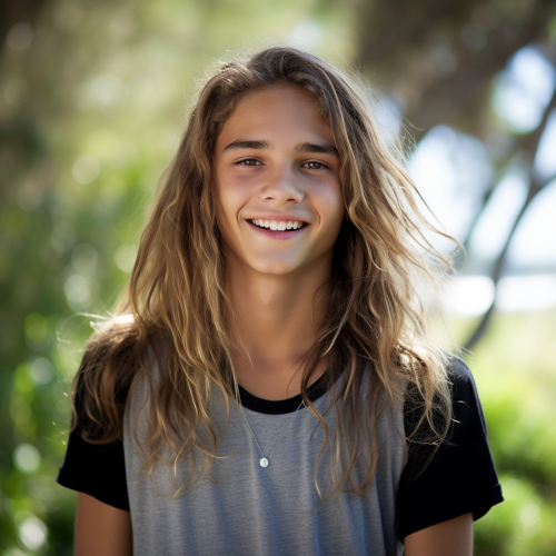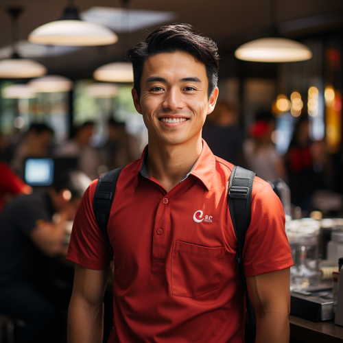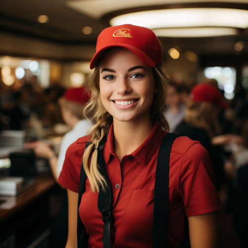 "Generate a hyper-realistic image of an Australian Gen Z teenager working at the drive-through of Carl's Jr. The teenager's attire is crucial: they are wearing the official Carl's Jr. uniform which consists of a distinctly red short-sleeve shirt paired with a pronounced black collar. Their warm smile showcases their friendly demeanor as a staff member." --s 750