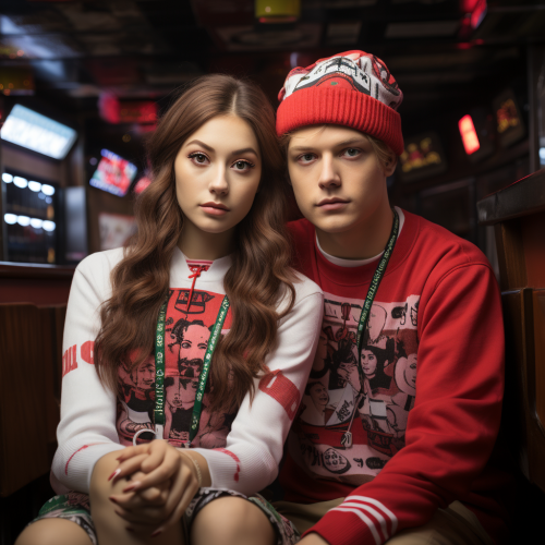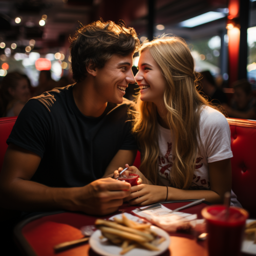 Using the image at [LINK_TO_IMAGE], transform the individuals into a teenage couple dressed in Gen Z-style clothing. Place them inside a Carl's Jr restaurant, with both of them enjoying hamburgers. --s 750