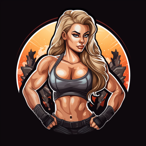 a cartoon logo of a female fitness bodybuilding champion wearing activewear looking muscular and beautif, bug tibed kegs