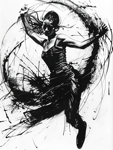 female salsa dancer at full swing. Very dynamic, very powerful, very graphic. Realistic ink. Style: empress of art. --ar 3:4 --v 6.0