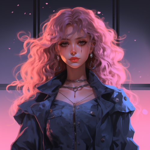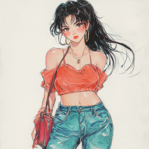 watercolor half body illustration of a charming 1990s anime girl, 90's hairstyle with black hair, retro 90s street fashion, jeans, a purse, expressive, tanned skin, vibrant colors. The drawing is done in the style of a vintage illustration with hand-drawn details, pastel colors and detailed character design. Far-shot, hyper-realistic, realism, aesthetic, sharpened, hyper detailed, high resolution, 32k, UHD