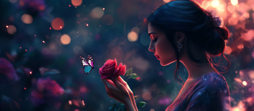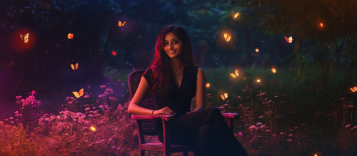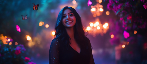 a beautiful indian girl wear a black outfit smiling looking in camera stading front view beautiful romantic without blur background forest night scene some flowers and chandelier beautiful light in background some butterfly flying dark red purple and blue theme cinematic --ar 16:7