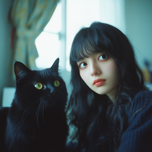 '90s Japanese anime, in room, 20s Japanese black long wavy hair green eys girl and black cat yellow eyes, shot with a 50mm lens, f/1.8, 1/250s shutter speed