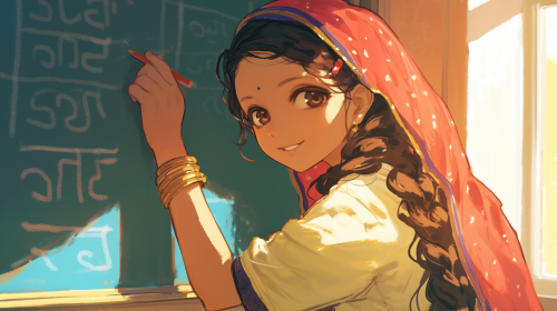 a 7-year-old Indian girl does division problems on the chalkboard in her classroom in India, she is smiling, high-definition, anime style, --ar 16:9 --niji 6