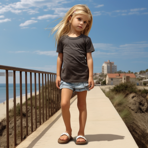 A hyper-realistic photograph of a female host with long blonde hair, white skin, wearing a basic t-shirt, blue shorts and white shoes. This woman is standing next to a male host with brown curly hair, white skin, wearing a basic white t-shirt and blue shorts with white shoes. --v 6.0