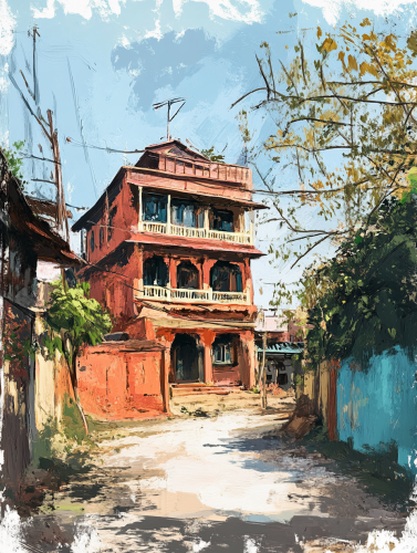 vernacular Indian style wada mansion on one side and modern wada style house on the other side in sketchy oil painting form poster, minimalist, --ar 3:4